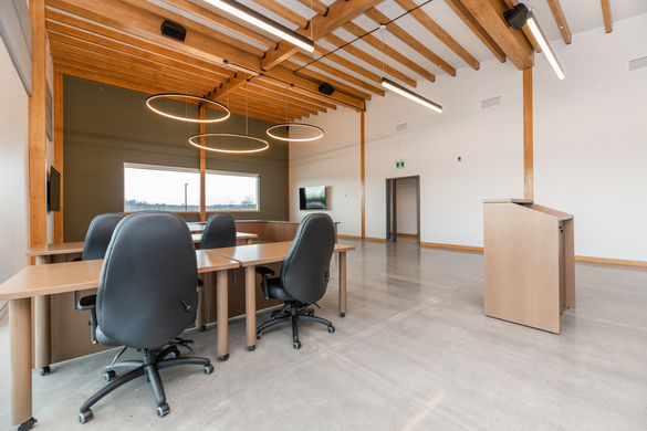 A two building, 5200 SF renovation to an existing community centre, a new 8300 SF municipal office, and 3.5 acres of civil work around both buildings. Featuring new kitchen, bathrooms, heated slab-on-grade, curtain wall, exposed glulam structure and various architectural sidings. Electrical work includes new distribution and large architectural light fixtures. Both buildings have geothermal heating. The civil work includes a large geothermal field, in addition to a septic field.